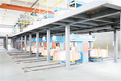12月13日,記者在臨潁縣銅基新材料產(chǎn)業(yè)園看到,金普森公司的生產(chǎn)線正在有序運(yùn)轉(zhuǎn),擠壓成塊的再生銅投入廢舊銅熔化爐,隨后變成一盤(pán)盤(pán)色澤金黃的高純度銅。“公司主要生產(chǎn)銅線材、合金復(fù)合銅線等。這些產(chǎn)品在各類電氣、化學(xué)工業(yè)、射頻電纜等領(lǐng)域得到廣泛應(yīng)用。”臨潁物流園區(qū)管委會(huì)副主任王永強(qiáng)告訴記者。