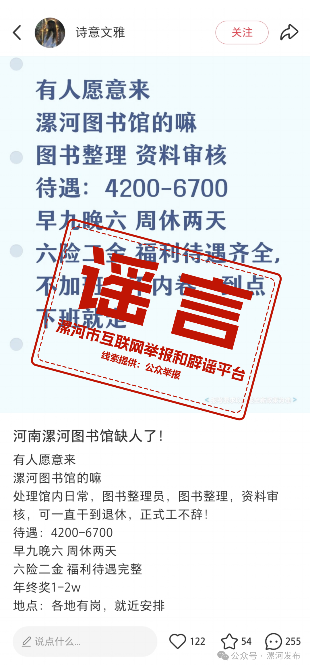 經(jīng)向相關(guān)部門核實(shí),漯河市圖書館并未發(fā)布此類招聘信息,該內(nèi)容系不法分子編造的虛假信息。據(jù)了解,漯河市圖書館所有招募、培訓(xùn)、合作洽談等官方信息,均通過漯河市人力資源和社會(huì)保障局網(wǎng)站、漯河市文化廣電和旅游局網(wǎng)站統(tǒng)一發(fā)布,漯河市圖書館從未授權(quán)任何自媒體平臺(tái)、商業(yè)網(wǎng)站、個(gè)人及第三方機(jī)構(gòu)以漯河市圖書館名義開展招聘及各類招錄相關(guān)活動(dòng)。