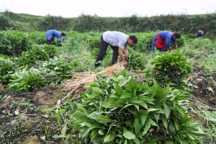 △2017年10月,貴州丹寨縣農(nóng)業(yè)產(chǎn)業(yè)扶貧項(xiàng)目——板藍(lán)根種植喜獲豐收。(圖自視覺中國)