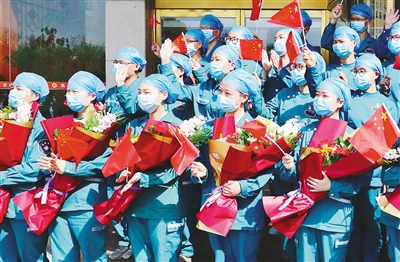 市委書記蒿慧杰在歡迎儀式上動情地說,鞭敲金蹬響,齊唱凱歌還。聽到白衣戰(zhàn)士們高唱“五星紅旗迎風飄揚,勝利歌聲多么嘹亮”,我們更加深切地體會到,在抗擊災(zāi)難中黨的偉大、祖國的偉大、人民的偉大。看到抗疫勇士們從最前沿勝利歸來、平安到家,我們和你們的家人一樣,非常高興。我代表市委、市人大、市政府、市政協(xié)和市疫情防控指揮部,向你們以及支持你們奔赴抗疫第一線的家人表示衷心的感謝和崇高的敬意!代表全市人民為你們點贊,歡迎你們回家!