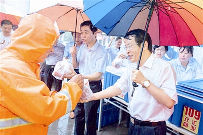 (記者 劉 丹 版式 付廣亞)市委書記蒿慧杰冒雨看望堅守一線的環(huán)衛(wèi)工人,并送上免費(fèi)愛心早餐。
