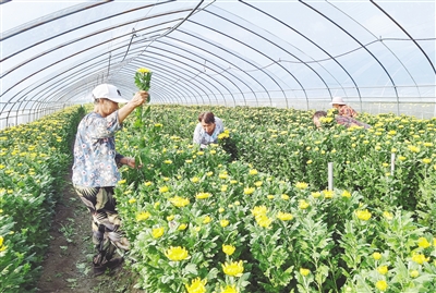 “干一天能掙60塊錢,比出門打工方便多了。旺季忙起來(lái)還有額外的加班費(fèi)!”幾名五六十歲的阿姨在大棚內(nèi)熟練地采摘著菊花。