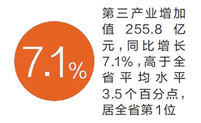 分產(chǎn)業(yè)看,三次產(chǎn)業(yè)增加值增速全面領(lǐng)先。第一產(chǎn)業(yè)增加值18.4億元,同比增長(zhǎng)2.9%,高于全省平均水平0.3個(gè)百分點(diǎn),居全省第四位;第二產(chǎn)業(yè)增加值189.2億元,同比增長(zhǎng)11.7%,高于全省平均水平5個(gè)百分點(diǎn),居全省第二位;第三產(chǎn)業(yè)增加值255.8億元,同比增長(zhǎng)7.1%,高于全省平均水平3.5個(gè)百分點(diǎn),居全省第一位。