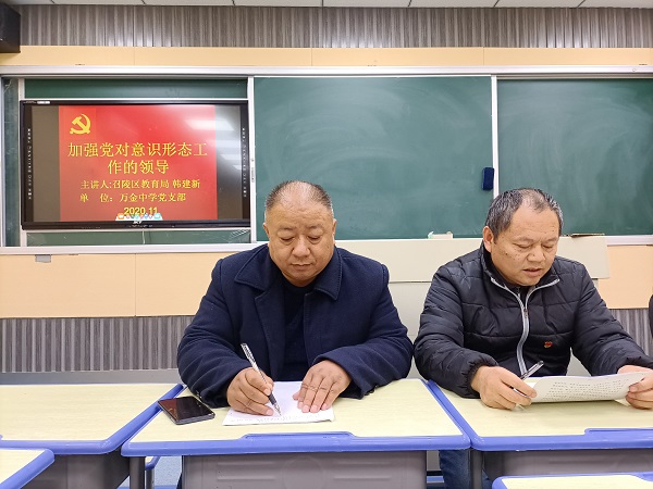 為加強(qiáng)黨對(duì)意識(shí)形態(tài)工作的領(lǐng)導(dǎo),穩(wěn)固基層黨員教師的意識(shí)形態(tài)工作,11月30日下午,召陵區(qū)教育局韓建新同志,在萬金中學(xué)東校區(qū),給萬金鎮(zhèn)全體黨員教師上了《加強(qiáng)和改進(jìn)黨對(duì)意識(shí)形態(tài)工作的領(lǐng)導(dǎo)》的思政課,此次會(huì)議由萬金中學(xué)黨支部副書記張曉斌同志主持。