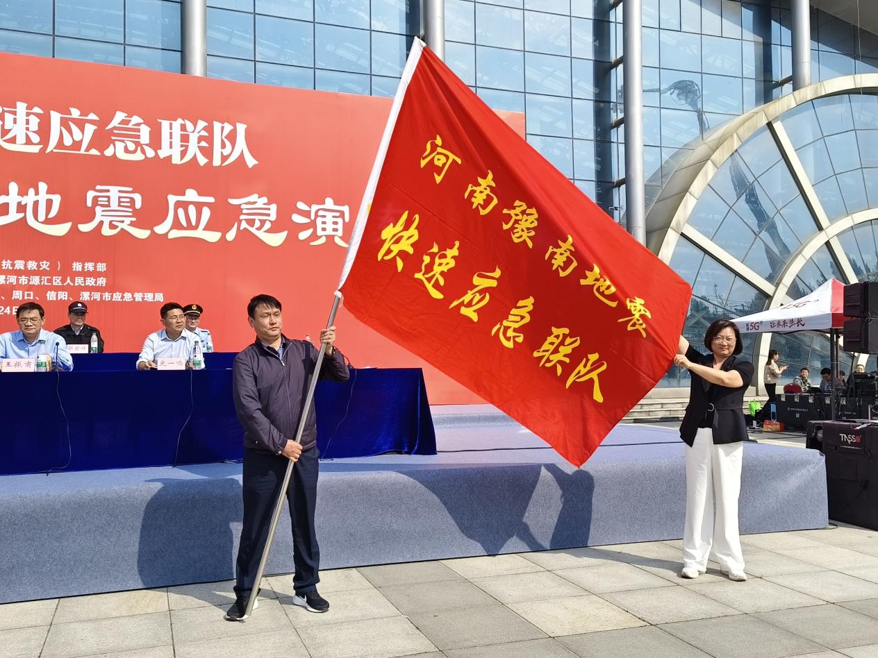 演練結(jié)束,漯河市防震減災(zāi)中心主任閆秋霞與周口市應(yīng)急保障中心主任袁志勇進(jìn)行了豫南地震快速應(yīng)急聯(lián)隊(duì)旗幟交接。
