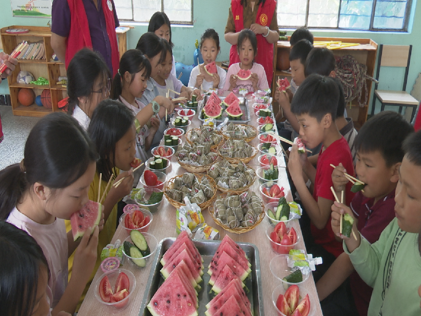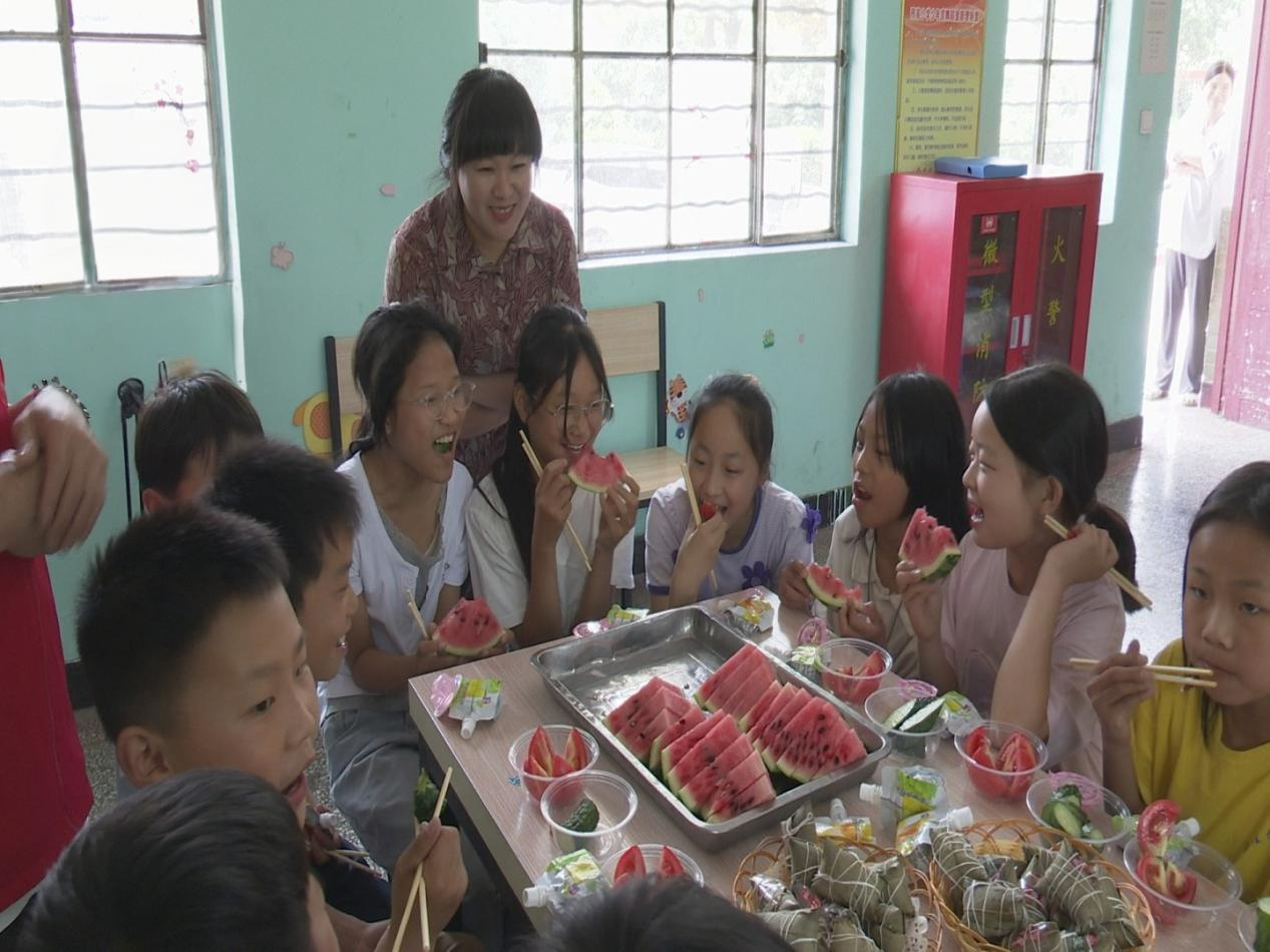 在三家店鎮(zhèn)高宗寨村兒童之家,鎮(zhèn)村干部們一早便忙活開來。他們精心準備了粽子、果凍,將鎮(zhèn)內特色農產(chǎn)品西紅柿、黃瓜、西瓜洗凈切片,撒上白糖,制成飽含愛意的美食?;顒蝇F(xiàn)場,孩子們圍坐在一起,伴隨著稚嫩的童聲合唱《小星星》,品嘗著酸甜可口的西紅柿、清爽多汁的果蔬拼盤和軟糯香甜的粽子,歡聲笑語此起彼伏。"太好吃啦!紅紅的西紅柿、圓圓的大西瓜、脆脆的黃瓜,還有甜甜的粽子,比我以前吃過的都好吃!我太喜歡了",高宗寨小學學生宋夢凡開心地分享著感受。鎮(zhèn)村干部們一邊與孩子們品嘗美食,一邊親切詢問學習生活情況,用實際行動傳遞溫暖關懷。