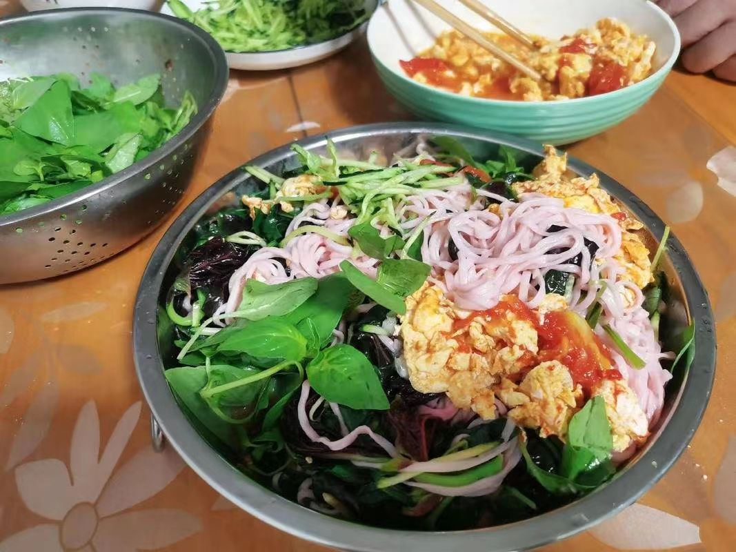 蒜香是源匯夏日的靈魂印記。紫皮蒜瓣剝落時(shí)迸濺汁液,辣意鉆入指甲縫,這是味覺蘇醒的前奏。粗陶蒜臼穩(wěn)踞灶臺(tái),石錘起落間,蒜粒與青鹽漸成乳白脂膏。此時(shí),十香菜翩然而至——這種被《神農(nóng)本草經(jīng)》記載的香草,在漯河人陽(yáng)臺(tái)的泡沫箱里蓬勃生長(zhǎng),葉片揉碎時(shí)散發(fā)薄荷與檸檬交織的清氣。