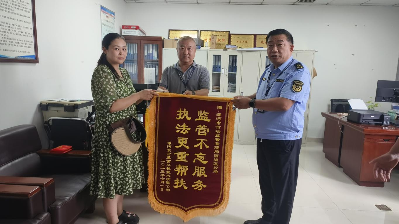 2025年7月7日下午,一名企業(yè)工作人員將一面繡著“監(jiān)管不忘服務(wù)、執(zhí)法更重幫扶”的錦旗送到漯河市市場監(jiān)督管理局西城區(qū)分局執(zhí)法人員手中,以表達(dá)對該局執(zhí)法人員幫扶企業(yè)的感謝之情。