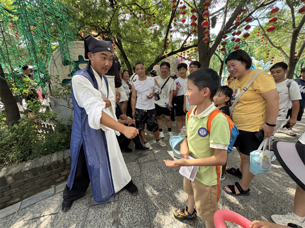 一踏入萬(wàn)歲山武俠城,古色古香的宋代街巷和建筑便映入孩子們眼簾,仿佛穿越回了千年前的大宋。街道上,鄭記肉鋪、獅子樓、王婆茶莊等實(shí)景店鋪,充滿生活氣息,孩子們好奇地打量著,想象著古人的生活場(chǎng)景。街邊藝人的精彩表演引得孩子們陣陣驚嘆,歡呼聲此起彼伏?!度蜃<仪f》里,逼真的城墻、城門、大炮和烽火臺(tái),激烈的戰(zhàn)斗場(chǎng)面配合影視爆破、云梯炮戰(zhàn)、大型馬術(shù)等實(shí)景拍攝技術(shù),將《水滸傳》中的情節(jié)鮮活呈現(xiàn),孩子們看得目不轉(zhuǎn)睛,被綠林好漢們的江湖豪情深深吸引,演出結(jié)束后,掌聲雷動(dòng)。在萬(wàn)歲山武俠城內(nèi),孩子們還觀賞了多場(chǎng)精彩絕倫的演出。從《吊環(huán)》的驚險(xiǎn)特技到《大宋奇兵》的英勇無(wú)畏,再到《李逵斷案》和《林沖戰(zhàn)楊志》……此外,孩子們還進(jìn)行了一系列互動(dòng)體驗(yàn)活動(dòng)。通過(guò)石頭剪刀布、投壺等游戲來(lái)賺取銀票,換取自己喜歡的物品。每一場(chǎng)演出都讓孩子們陶醉其中,流連忘返。