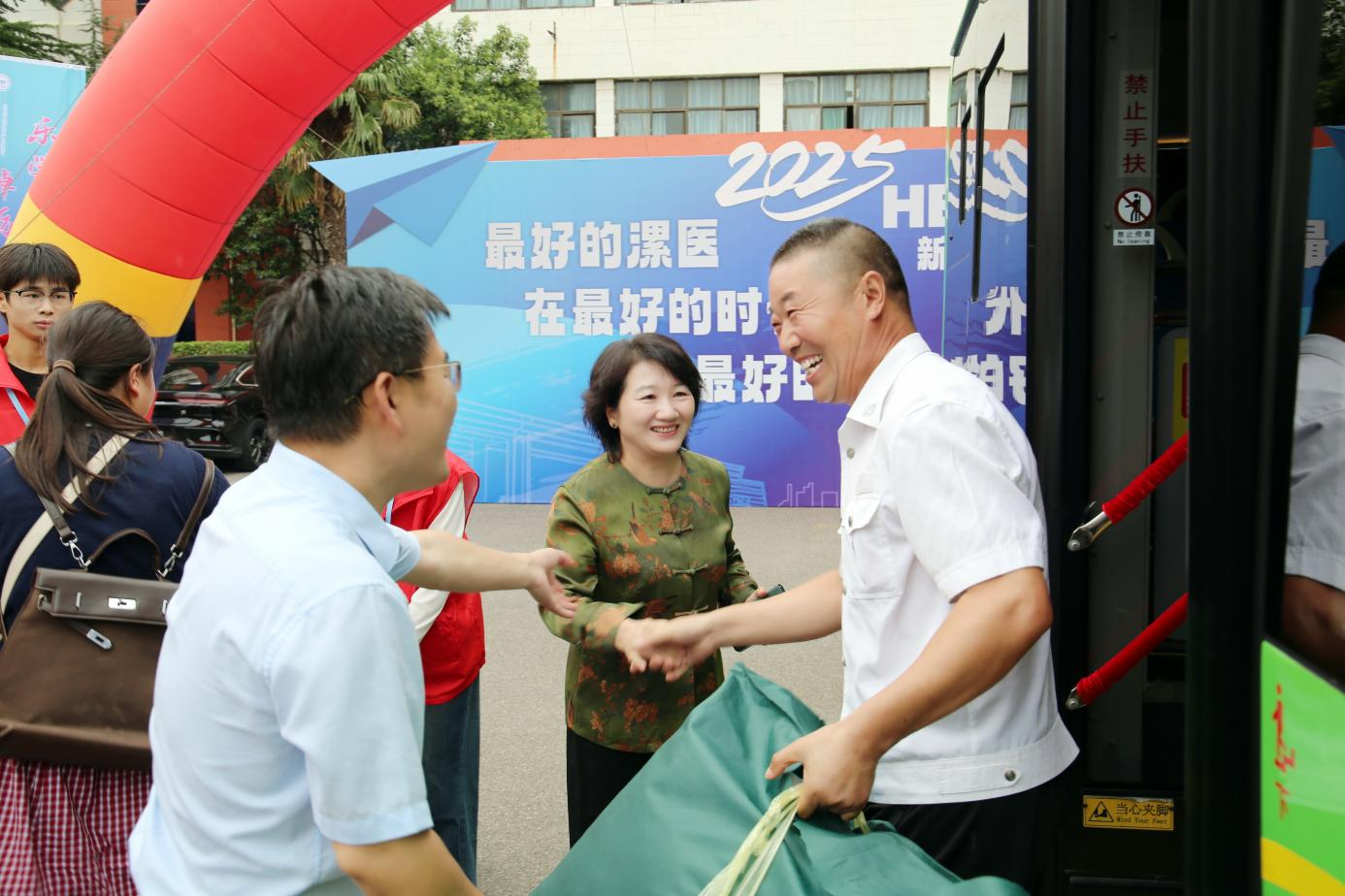 青春乘秋風(fēng),壯志啟新程。8月30日,漯河醫(yī)專迎新工作全面拉開帷幕,上午8時(shí),校長(zhǎng)張祎捷、校黨委副書記邊曉峰分別帶領(lǐng)校領(lǐng)導(dǎo)班子深入源匯校區(qū)、召陵校區(qū)迎新現(xiàn)場(chǎng),迎接第一輛駛?cè)胄@的新生班車,親切看望2025級(jí)新生及家長(zhǎng),并慰問(wèn)一線工作人員和志愿者。