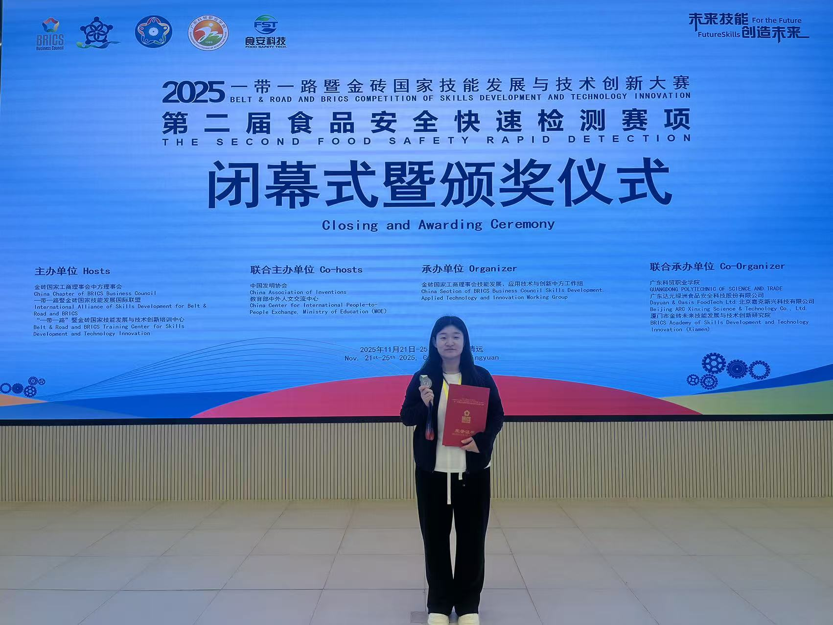 近日,2025“一帶一路”暨金磚國(guó)家技能發(fā)展與技術(shù)創(chuàng)新大賽“食品安全快速檢測(cè)賽項(xiàng)”全國(guó)總決賽在廣東科貿(mào)職業(yè)學(xué)院落下帷幕。漯河醫(yī)學(xué)高等??茖W(xué)校(以下簡(jiǎn)稱“漯河醫(yī)專”)公共衛(wèi)生與健康營(yíng)養(yǎng)學(xué)院教師陳沖憑借扎實(shí)的專業(yè)知識(shí)和精湛的實(shí)踐操作能力,在教師賽中脫穎而出,榮獲二等獎(jiǎng),充分展現(xiàn)了學(xué)校在食品安全快速檢測(cè)領(lǐng)域的教學(xué)實(shí)力與人才培養(yǎng)質(zhì)量。