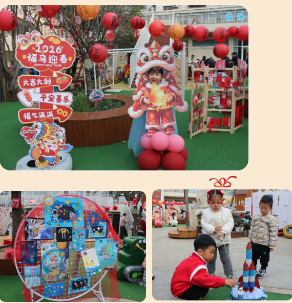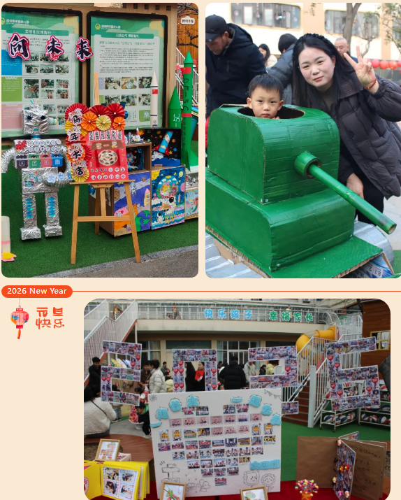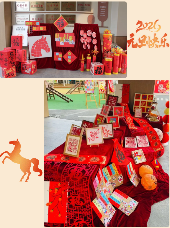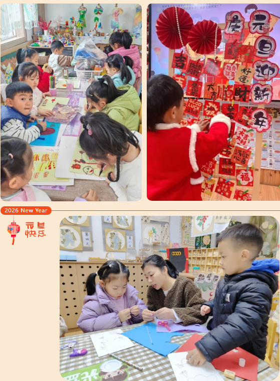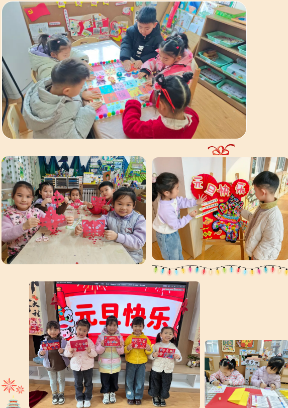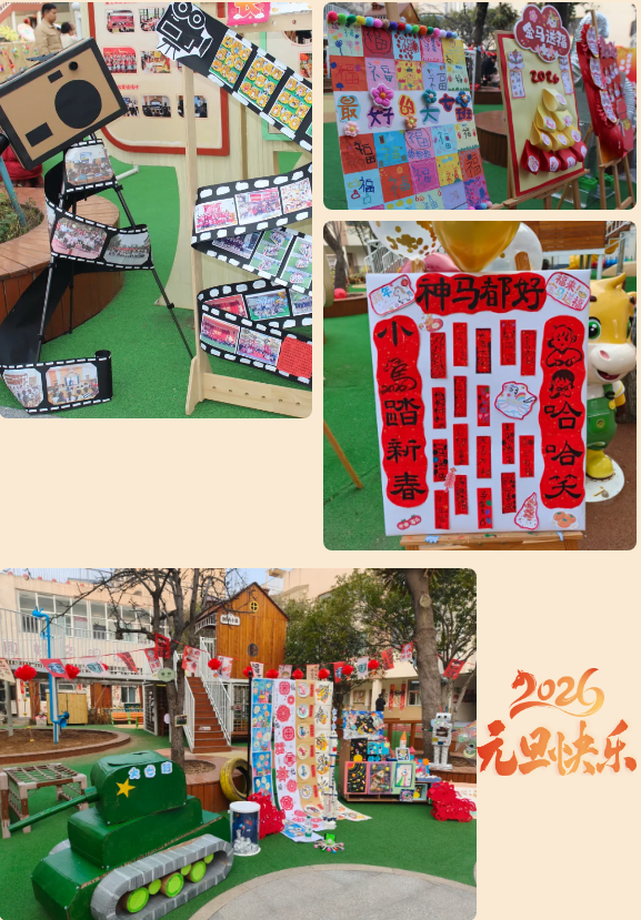 元旦節(jié)環(huán)境創(chuàng)設(shè)圍繞“收藏昨天 開啟明天”的創(chuàng)意主線,幼兒園精心布置了“元旦喜樂區(qū)—時(shí)光收藏夾—心愿驛站—未來啟航站”四大展區(qū)。大班孩子的手工作品與藝術(shù)創(chuàng)作相映成趣,各班呈現(xiàn)科技小制作與多彩繪畫,共同裝點(diǎn)出童趣盎然的節(jié)日空間。班級(jí)環(huán)境也融入傳統(tǒng)元素與兒童創(chuàng)意,讓每一處角落都流淌著溫馨與想象。