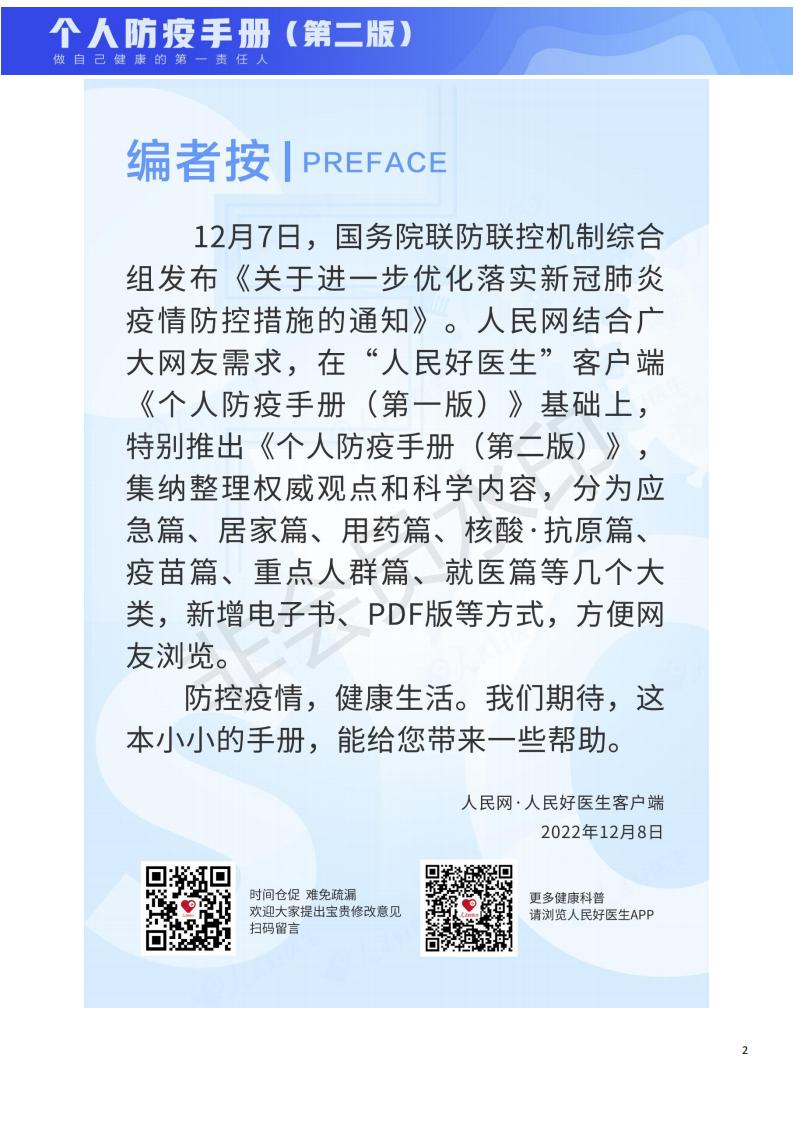 12月7日,國務院聯(lián)防聯(lián)控機制綜合組發(fā)布《關于進一步優(yōu)化落實新冠肺炎疫情防控措施的通知》。人民網結合廣大網友需求,特別推出《個人防疫手冊(第二版)》,集納整理權威觀點和科學內容,分為應急篇、居家篇、用藥篇、核酸·抗原篇、疫苗篇、重點人群篇、就醫(yī)篇等幾個大類,以有用、實用為導向,精選網友想要了解的問題,提供最新的權威解答。