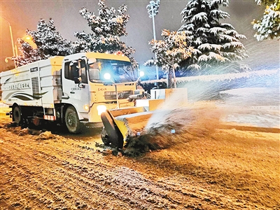 夜已深,在路燈燈光的照射下,雪花漫天飛舞。楊建和張國貞已經(jīng)把會展中心附近路面的雪清了一遍。隨后,他倆又駕車趕往下一個路段。