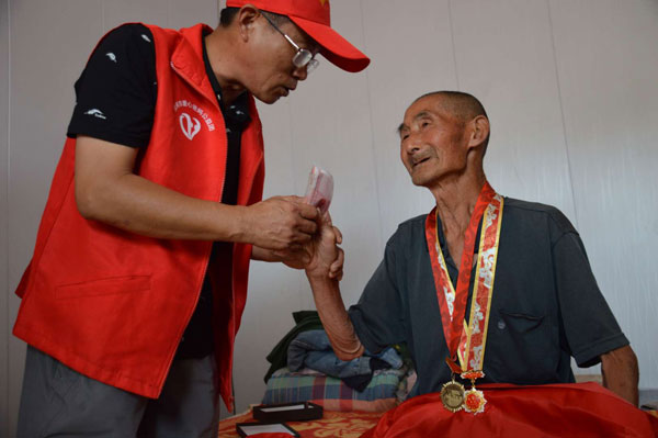 漯河市“愛心爸媽”公益團(tuán)一行20人,驅(qū)車120余公里,帶著全團(tuán)三百五十八位成員的濃濃愛心,帶著對(duì)老英雄們深深的敬仰,帶著慰問(wèn)品和慰問(wèn)金,先后慰問(wèn)了陽(yáng)縣舞泉鎮(zhèn)的張保安(90歲)、馬志祥(87歲),九街鎮(zhèn)藏灣村的藏彥邦(88歲)和牛趙村的趙中范(89歲)等四位抗美援朝老英雄。同時(shí),看望了兩代軍人之家藏軍輝家庭。