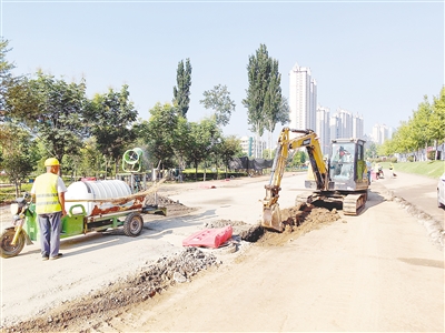 9月7日上午8時30分,記者在施工現(xiàn)場看到,道路已經(jīng)開挖,濱河路兩側的擋墻也已建成,工人正在拆除北側擋墻的腳手架和支撐板,多臺大型機械原地待命隨時準備作業(yè)。