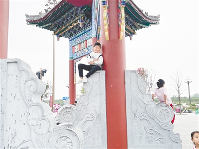 10月5日,漯灣古鎮(zhèn)內(nèi)。由于家長(zhǎng)監(jiān)管的缺失,有小朋友攀爬到景區(qū)的建筑上,既不文明又存在安全隱患。