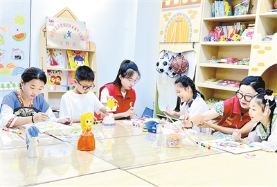 西城區(qū)月灣湖社區(qū)青少年活動室里,志愿者在教孩子們做手工。記者 齊國霞 攝