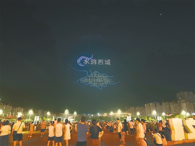 7月11日20時,上千架無人機騰空而起,先組成“漯河味道”四字,轉瞬之間化作奔騰河流與展翅飛鳥,最終組成“水韻西城”字樣。“太壯觀了!”市民舉著手機驚呼,閃光燈與夜空中的光點交相輝映。市民之家南門前廣場成了光影的海洋。