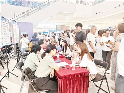 家長帶著孩子來了、年輕夫妻攜手來了、剛畢業(yè)的大學(xué)生來了……求職者及其同行者像逛街一樣,穿梭于各展位間,駐足詢問、投遞簡歷。