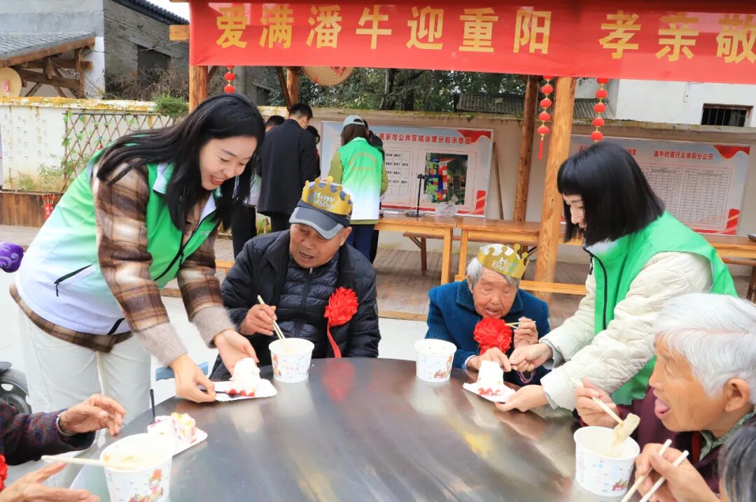 幸福苑內(nèi),“壽星賀重陽(yáng)”儀式溫馨舉行。駐村第一書(shū)記趙基元與志愿者們?yōu)榇謇?0歲以上高齡老人佩戴大紅花、生日帽,送上定制壽星大蛋糕。“沒(méi)想到這么大年紀(jì),村里還一直惦記著我們……”91歲的賈奶奶激動(dòng)不已,樸實(shí)話(huà)語(yǔ)里滿(mǎn)是感動(dòng)。