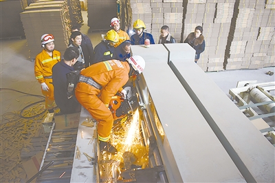 怎么辦?救援人員分為兩組,一組對機(jī)器進(jìn)行拆卸,一組利用撬杠等工具撬動(dòng)鋼卷軸。最終,被困女工被成功救出。