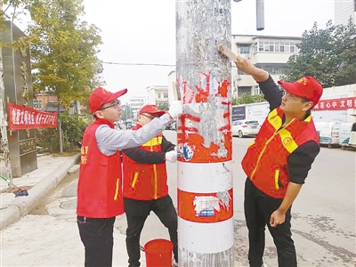 10月16日,臨潁縣人民法院組織志愿者走進(jìn)轄區(qū)銀河家園小區(qū)開展志愿服務(wù)。圖為志愿者在清理電線桿上的小廣告。王 波 攝