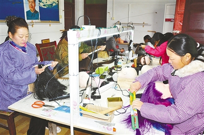 凍艷菊(左一)正在加工假發(fā)制品。