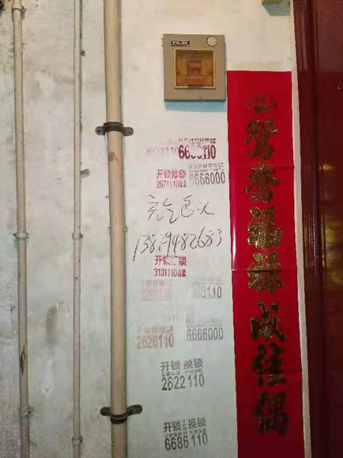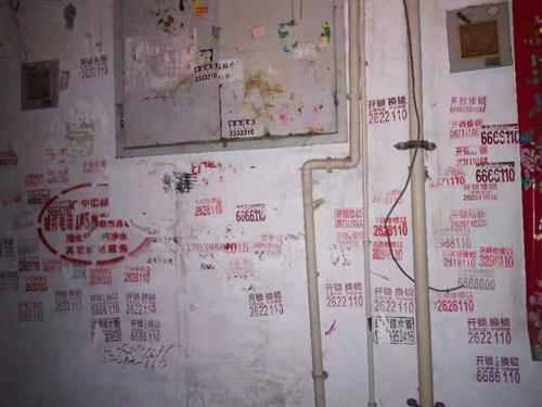 3515社區(qū)55號樓2單元樓道被寫滿小廣告。