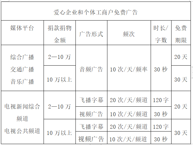 1、服務(wù)對(duì)象:在疫情防控期間,凡向我市防疫一線(xiàn)捐款捐物的企業(yè)、個(gè)體工商戶(hù)(包括本地和外地企業(yè)),均可享受免費(fèi)廣告服務(wù)。