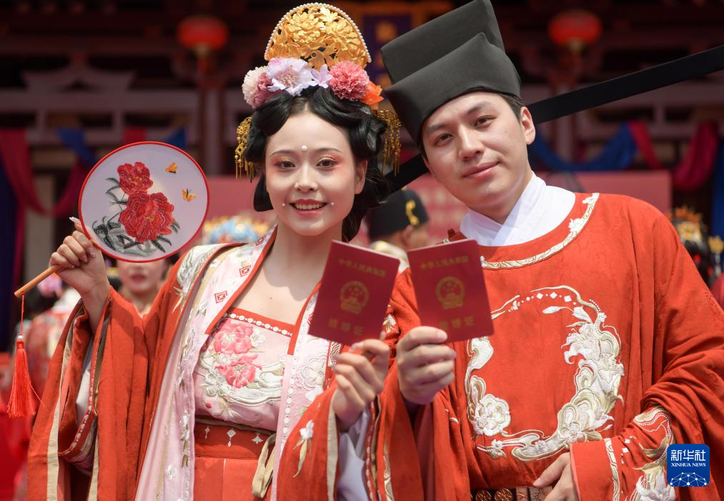 5月20日,在河南省洛陽市上陽宮,參加公益集體傳統(tǒng)婚禮的一對新人展示自己的結(jié)婚證。