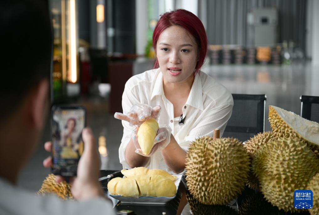 7月20日,在海南省三亞市優(yōu)旗大嘴鳥榴蓮園一號基地,網(wǎng)絡(luò)主播在視頻直播中介紹國產(chǎn)榴蓮。