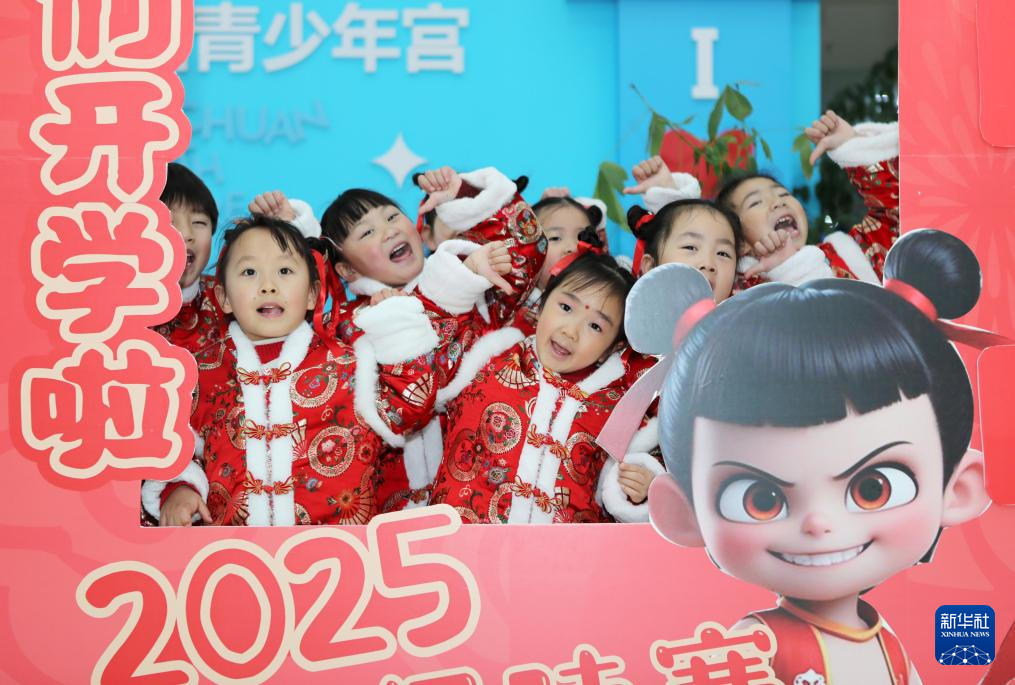 2月23日,在重慶市永川區(qū)青少年活動(dòng)中心,孩子們與哪吒卡通形象合影。