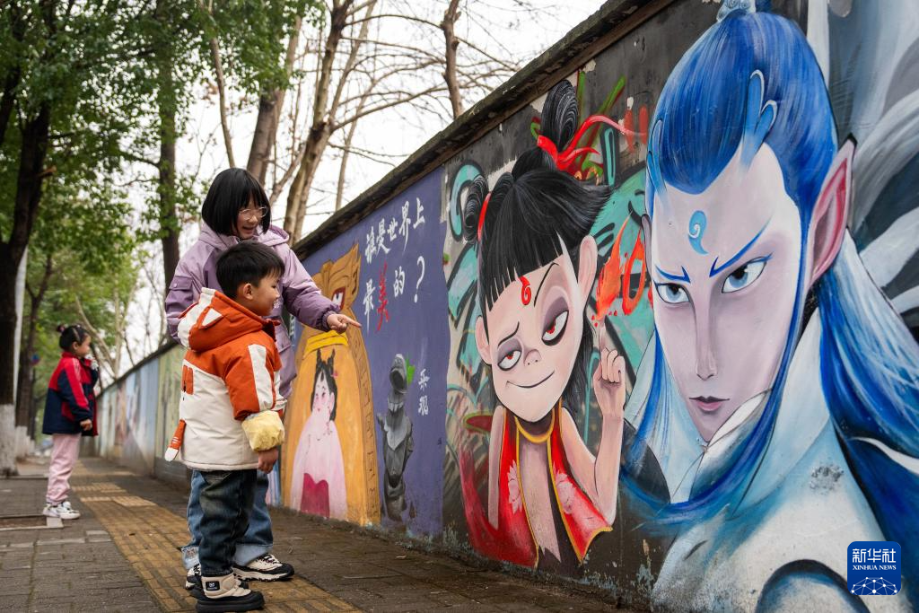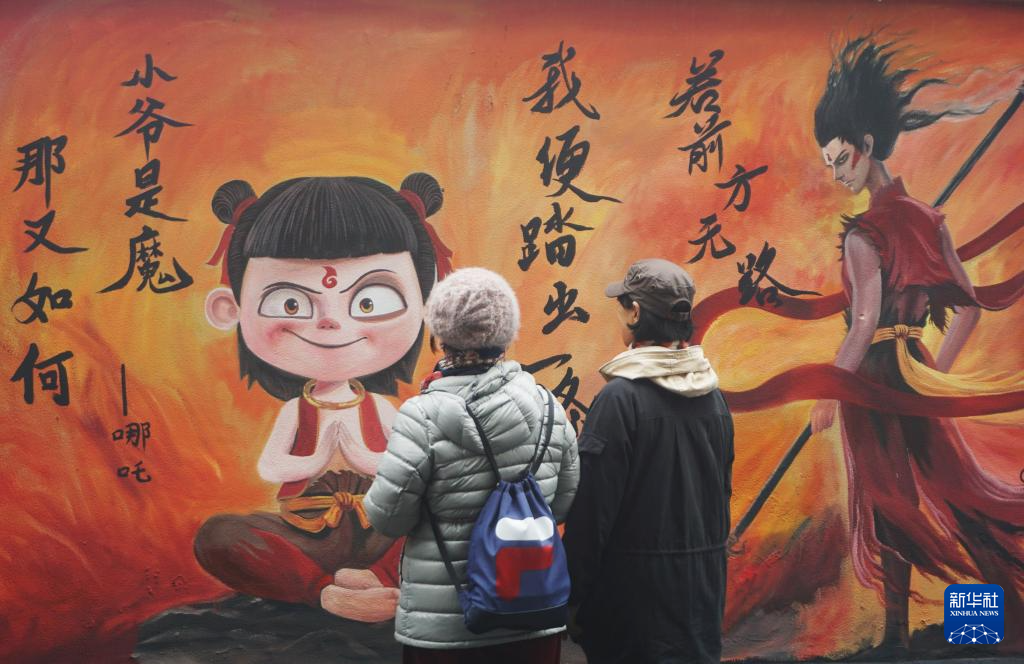 2月23日,市民在長(zhǎng)沙市岳麓區(qū)岳麓街道五星村觀看哪吒主題墻繪。