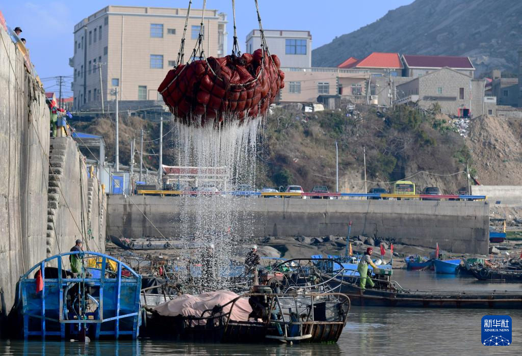 在莆田南日島海域碼頭,漁民剛收獲上岸大規(guī)格鮑魚,為春耕布網(wǎng)放苗做準(zhǔn)備(2月27日攝)。