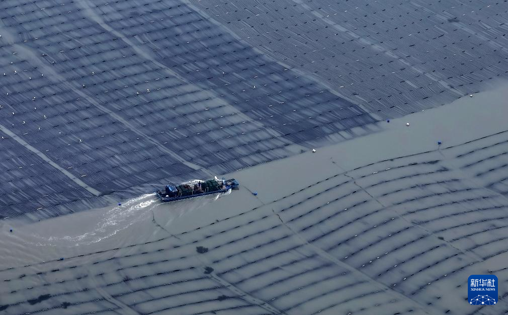 一艘海上養(yǎng)殖作業(yè)船穿行在莆田南日島海域的龍須菜養(yǎng)殖區(qū)(無人機(jī)照片,2月27日攝)。