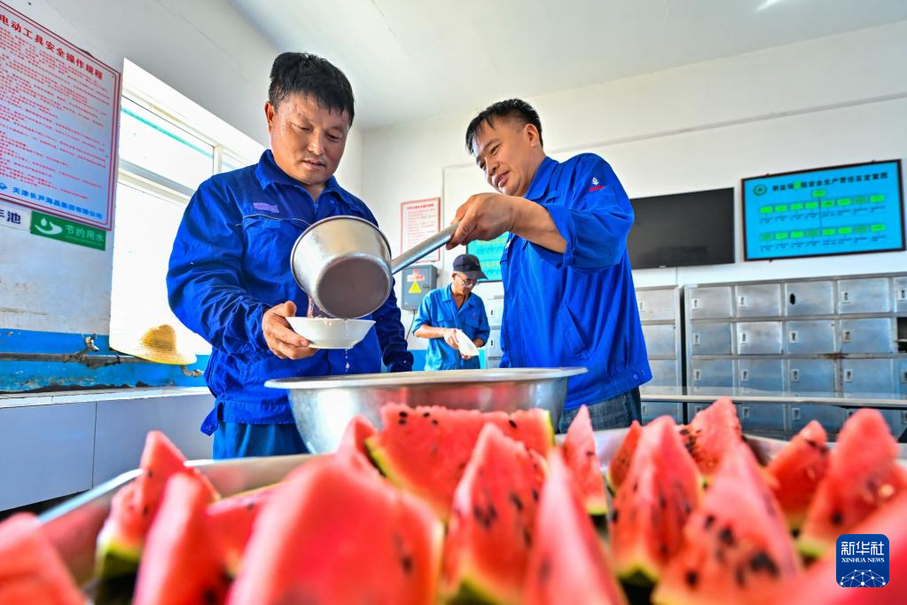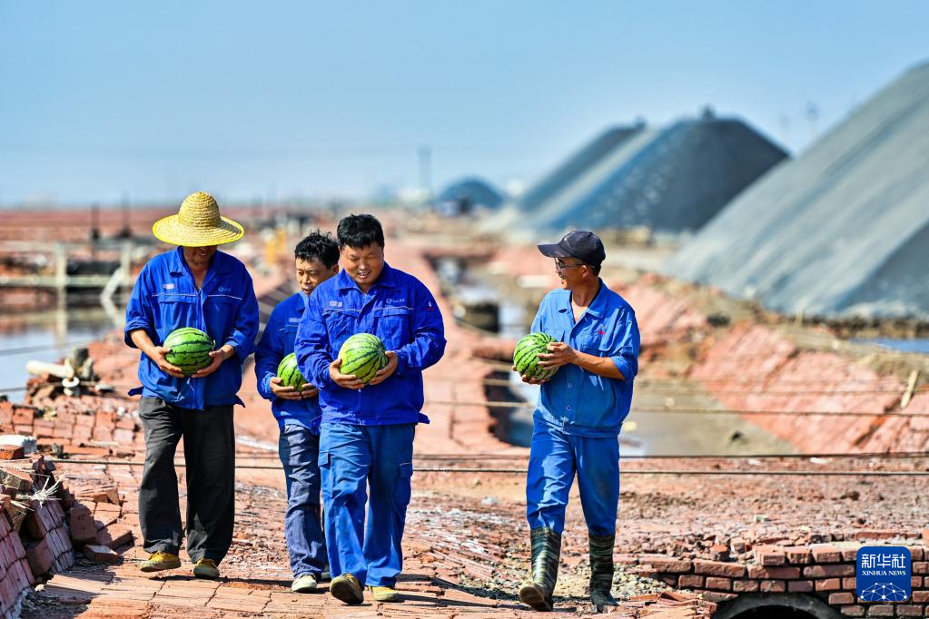 7月13日,在天津長蘆海晶集團有限公司的鹽田作業(yè)現(xiàn)場,工人領(lǐng)取西瓜。