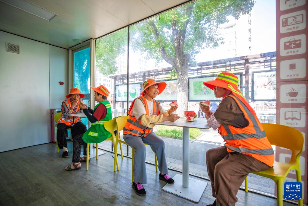 7月13日,環(huán)衛(wèi)工人在江蘇省興化市昭陽街道滄浪社區(qū)的工會驛站吃西瓜消暑。