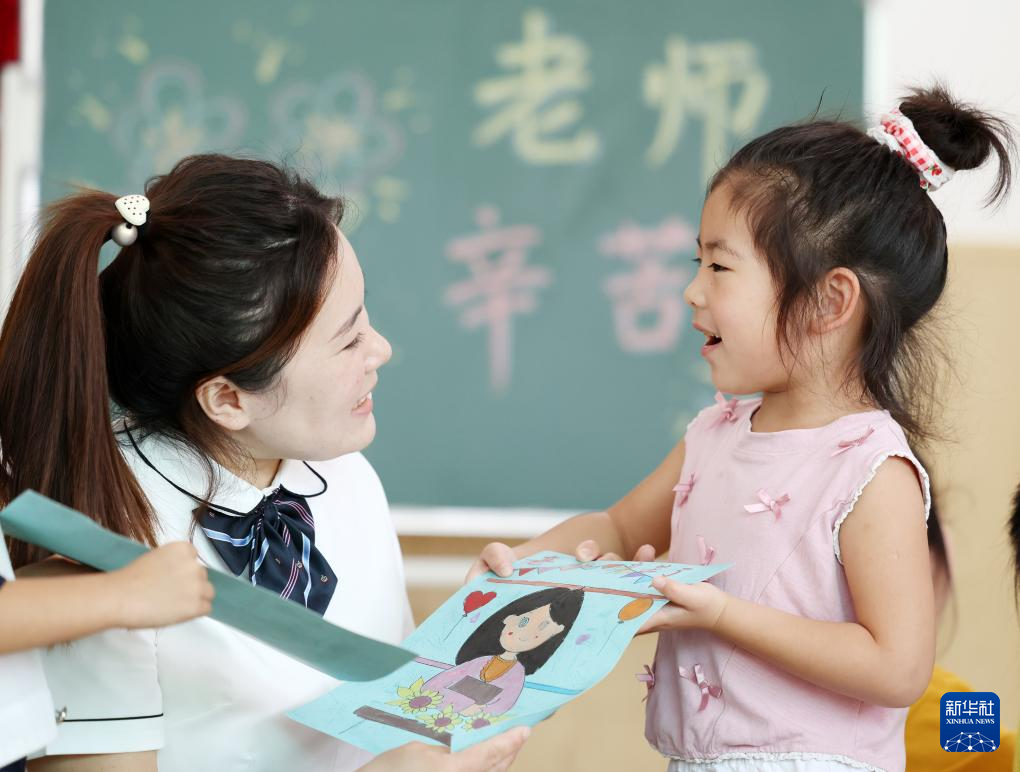 9月9日,山東省臨沂市郯城縣郯城街道官塘幼兒園的孩子將在老師的指導(dǎo)幫助下制作的繪畫送給老師。
