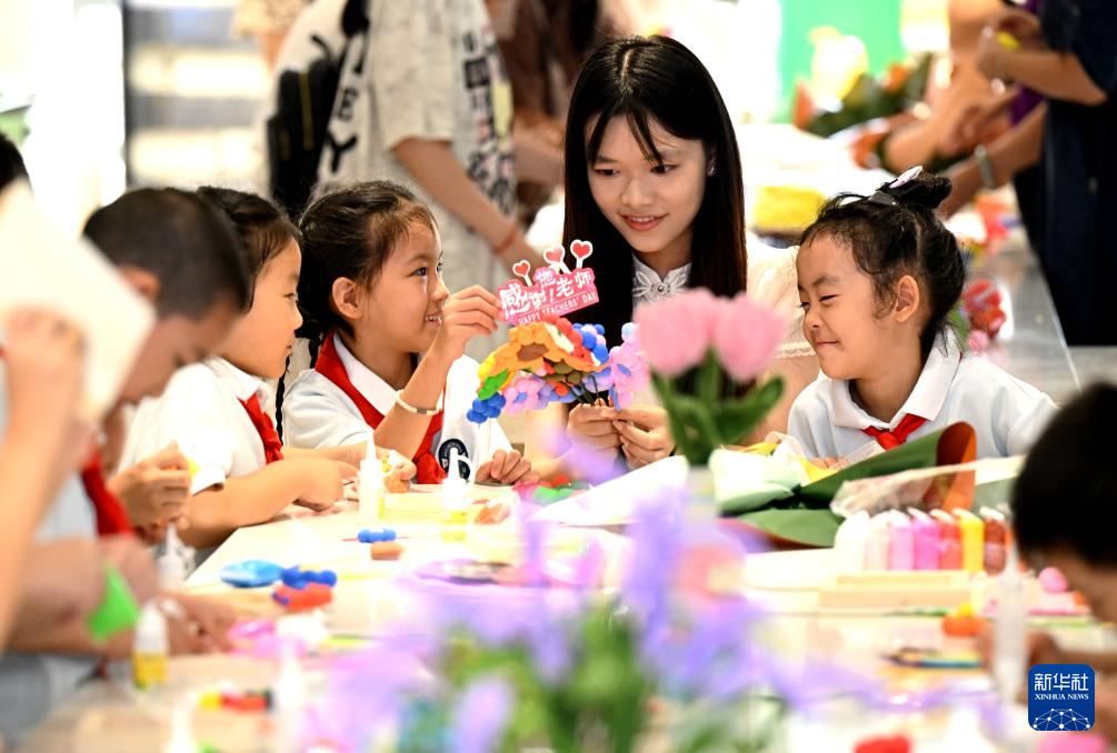 9月9日,在河北省石家莊市柏林莊學(xué)校開展的“黏土做花寄師恩”主題活動中,孩子們用粘土制作花束,為老師送上節(jié)日的祝福。