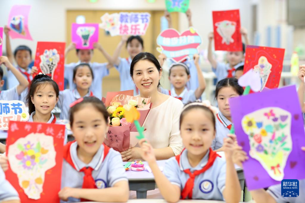 9月9日,在武漢市未來實(shí)驗(yàn)小學(xué)美林校區(qū),學(xué)生為教師送上節(jié)日祝福。